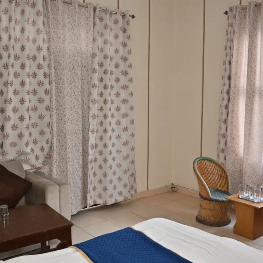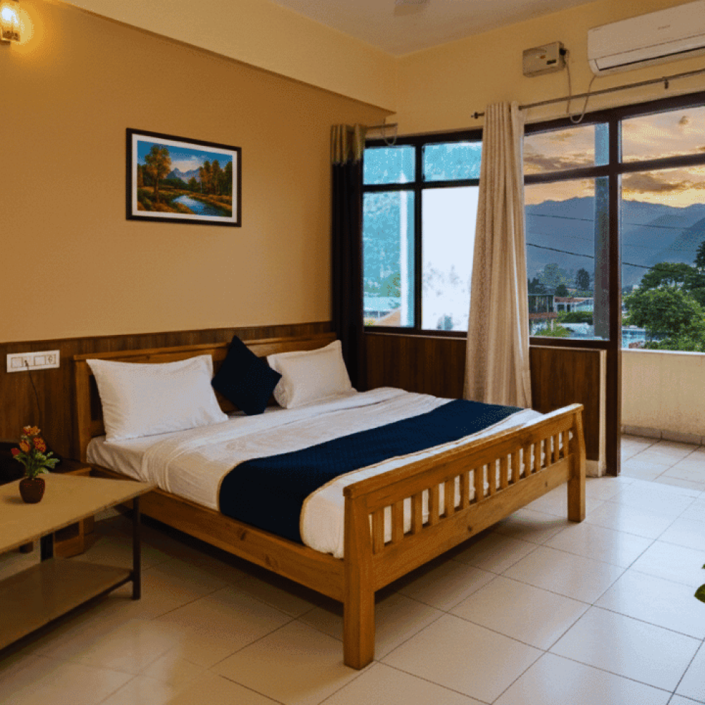 Our Deluxe Room offers a refined blend of elegance, comfort, and peaceful ambience—perfect for travellers who prefer a spacious, beautifully designed stay experience in Bhimtal. This room welcomes you with a warm interior, premium furnishings, and a soothing atmosphere that makes relaxation effortless. The soft lighting, stylish décor, and comfortable double bed create an inviting space where you can unwind after exploring the hills.